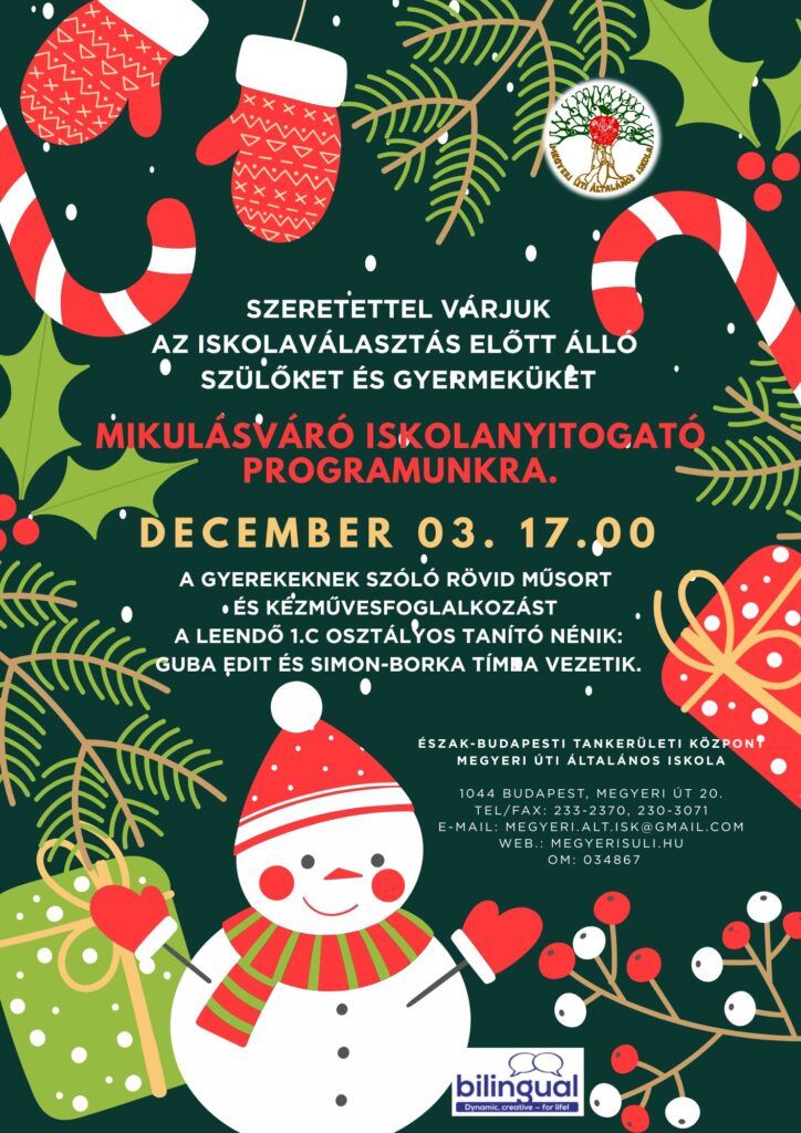 Szeretettel várjuk az iskolaválasztás előtt álló szülőket és gyermeküket mikulásváró iskolanyitogató programunkra! A gyerekeknek szóló rövid műsort és a kézműves foglalkozást a leendő 1.c osztályos tanító nénik vezetik.